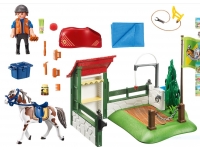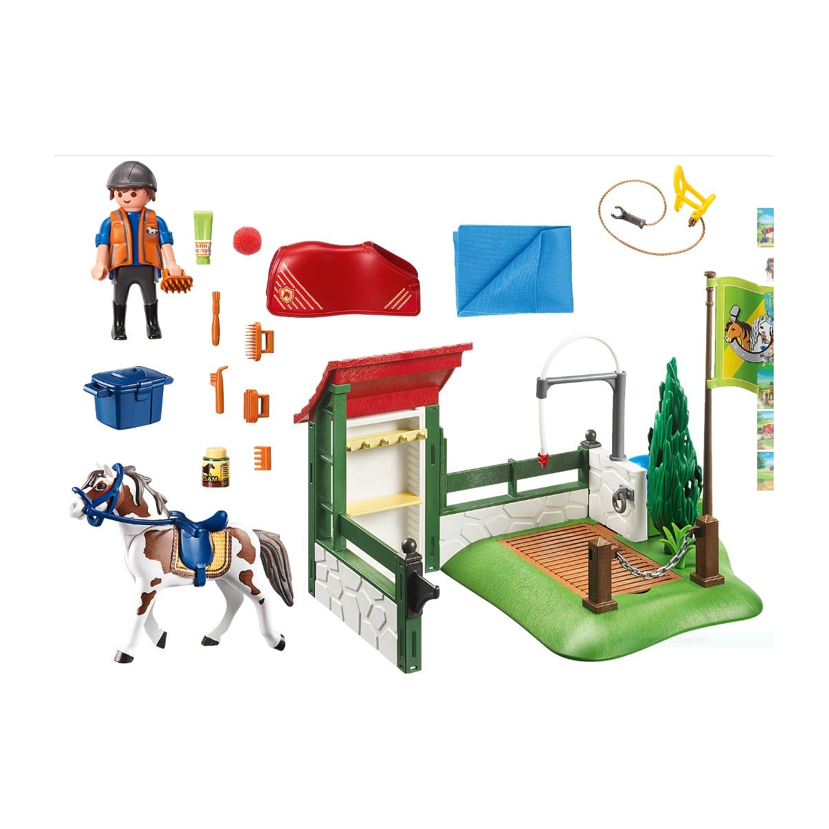 Con ducha que funciona mediante una bomba de agua manual. Incluye figura, caballo, área de lavado, gel, esponja, correa, cepillos, caja con tapa y vestimenta para el caballo.