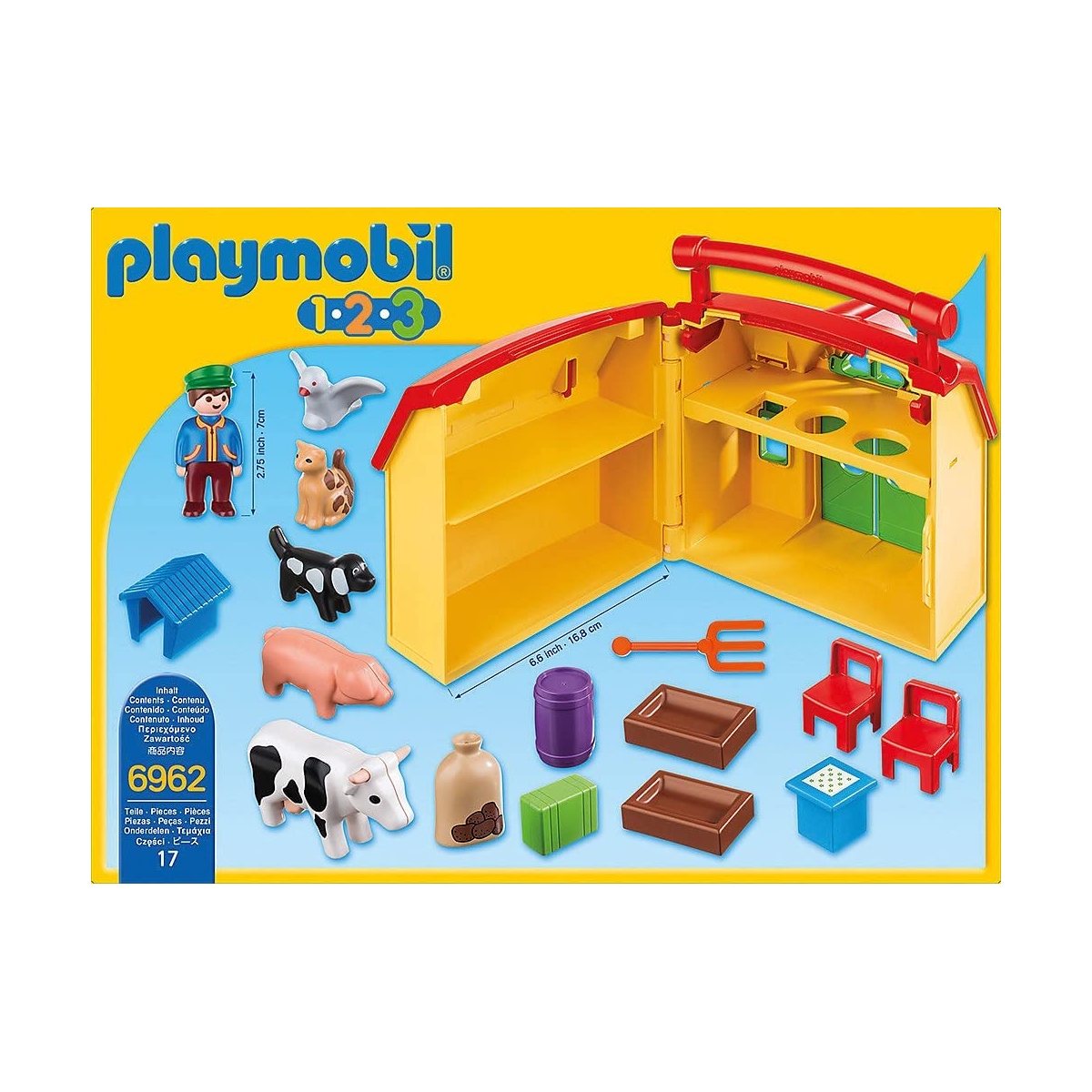 Con simpáticos animales de granja. Parte superior con función de clasificación para el heno. El tractor (6964) se puede aparcar cerca de la puerta de la granja. Dimensiones abierto: 35 x 11 x 19 cm (LxPxA)