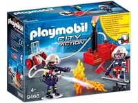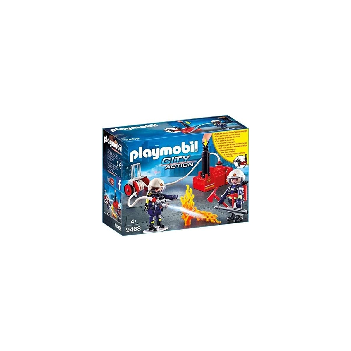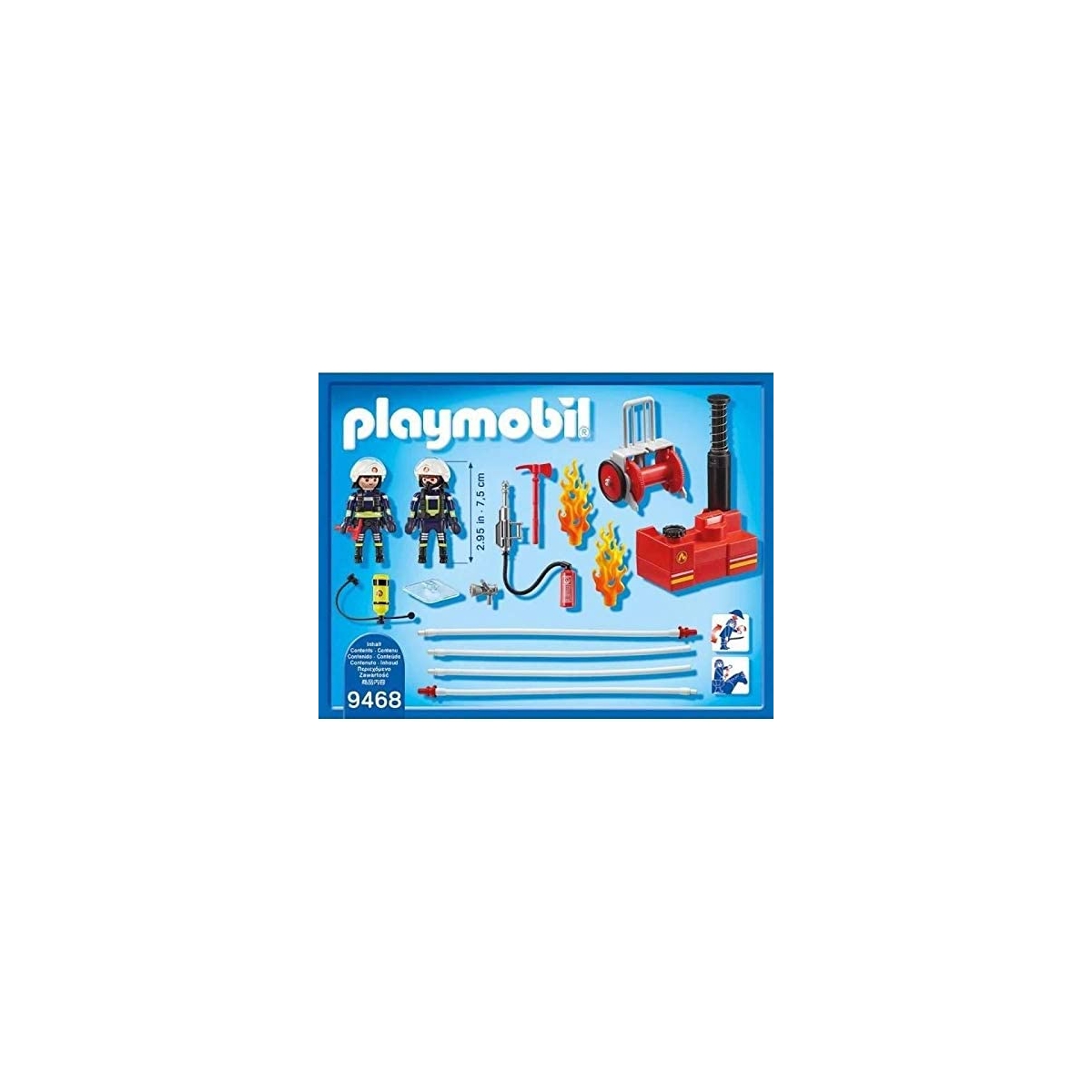 "Vamos, tenemos una operación", dice el bombero a su compañero. Por supuesto, no lo pide dos veces y coge su equipo. Empieza con el casco, el hacha y la bomba de incendios. El fuego no es un problema para los experimentados bomberos de PLAYMOBIL. Cerca de la realidad: La bomba de agua que funciona puede llenarse de agua y accionarse pulsando la bomba.