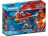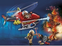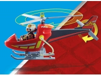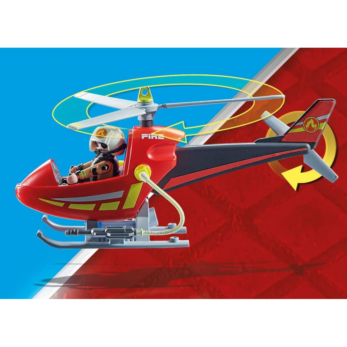 Llamada de emergencia al parque de bomberos: Una barbacoa se ha incendiado en Playmo City y el fuego se ha extendido al árbol adyacente. Los bomberos se aproximan desde el aire con el moderno helicóptero de rescate de incendios PLAYMOBIL. Con calma, el piloto dirige su helicóptero sobre el fuego y apunta con el cañón de extinción. Con un chorro de agua, el fuego se extingue. Afortunadamente, no hay heridos. El set incluye dos figuras PLAYMOBIL, un helicóptero de extinción de incendios con cañón giratorio, una parrilla, un árbol con llamas acoplables, un casco de piloto y muchos otros extras para realizar emocionantes operaciones de rescate desde el aire. Las hélices del helicóptero pueden girar. Se pueden disparar flechas de chorro de agua desde el cañón de fuego situado en el lateral del helicóptero. El helicóptero de bomberos puede combinarse con el parque de bomberos (71193).