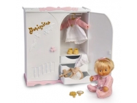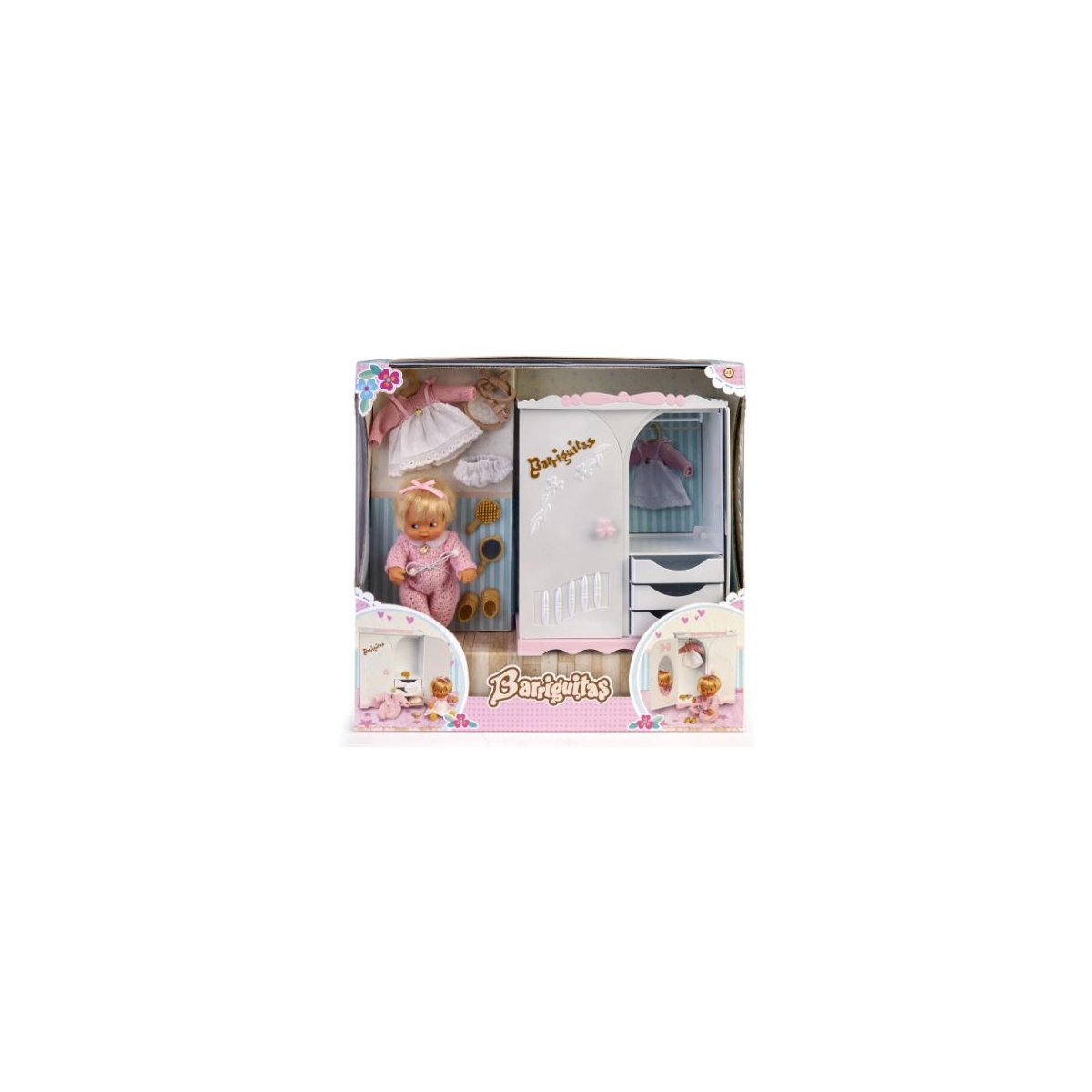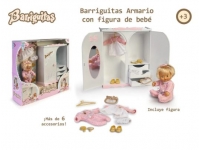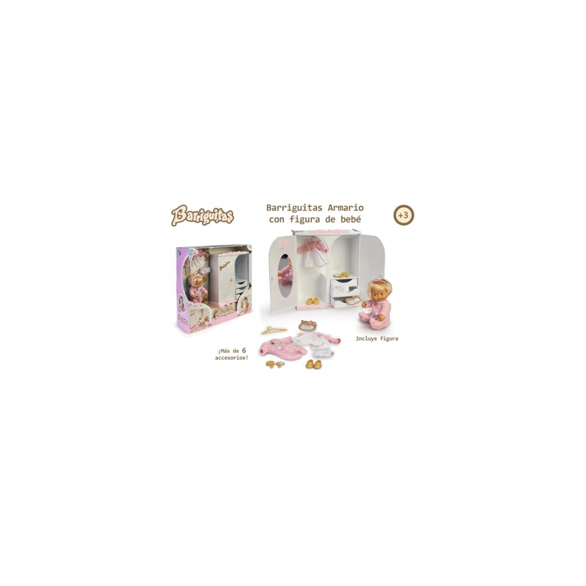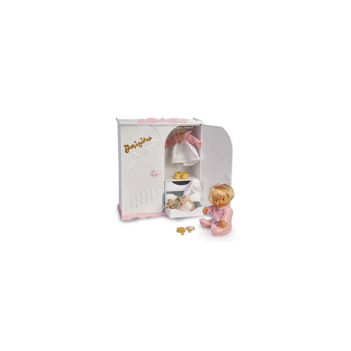 Elegante armario blanco de estilo clásico, decorado con detalles en rosa y dorado. Incluye un bebé Barriguitas vestido con un body de punto de tono rosa.
