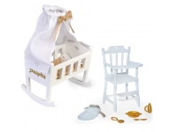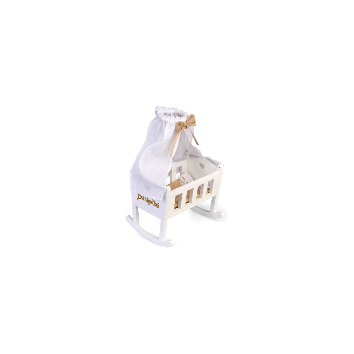 Cuna de estilo princesa con dosel y ropa de cama con preciosos detalles.