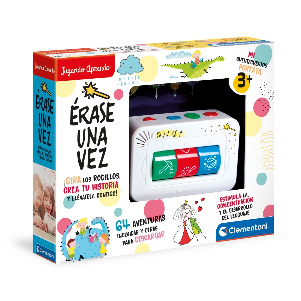 Cada combinación revela una historia diferente y un mundo de cuentos fantásticos para explorar eligiendo personajes, escenarios, emociones y nuevos eventos cada vez.  Un narrador interactivo para crear y escuchar 64 historias, cuyos elementos se pueden combinar de forma diferente cada vez.  El niño puede girar 3 rollos para decidir el escenario de la historia y el protagonista (entre animales, personajes ficticios o disfrazados y profesiones) para crear el cuento eligiendo su final.  Un juego ideal para estimular la imaginación, la capacidad auditiva y la atención en los niños pequeños.