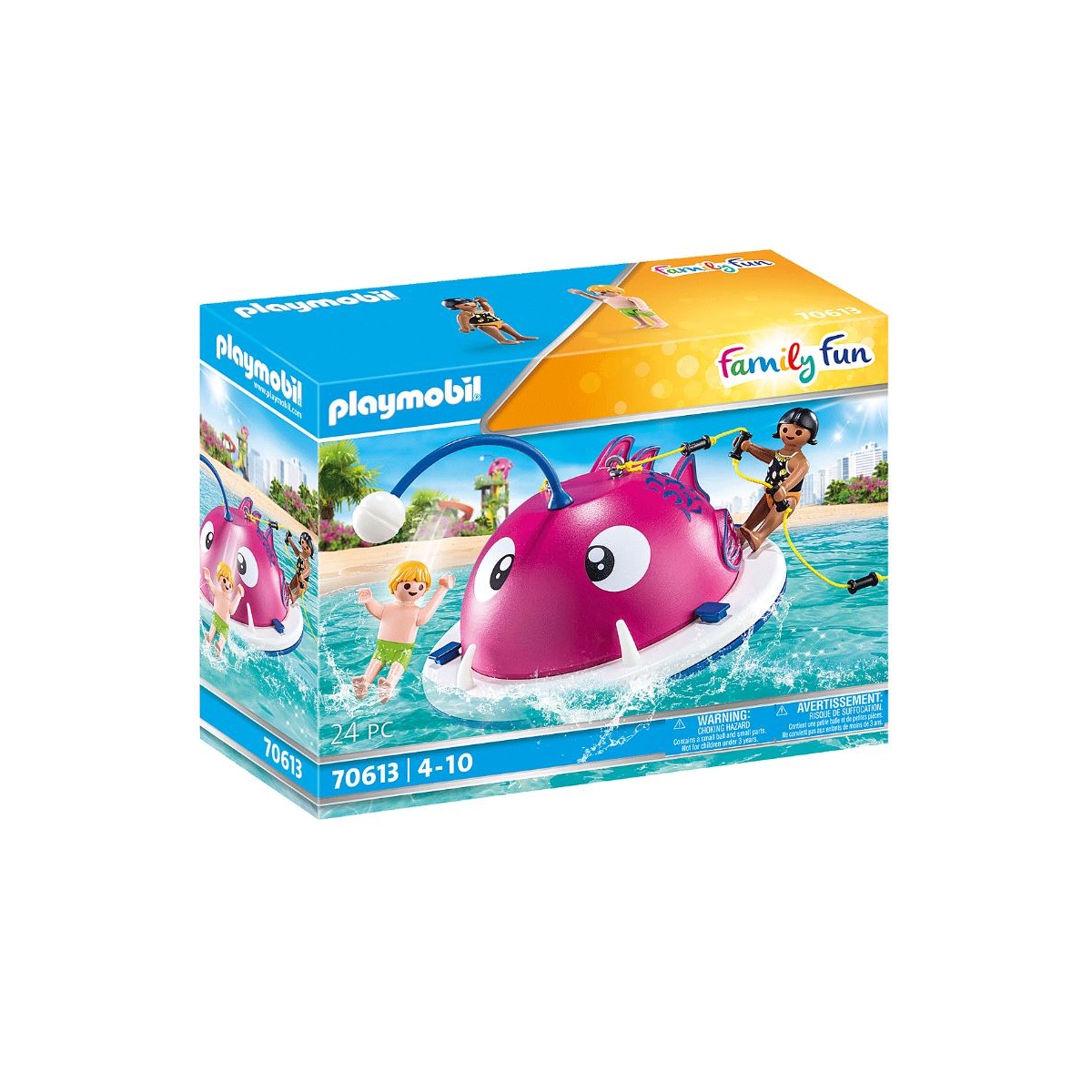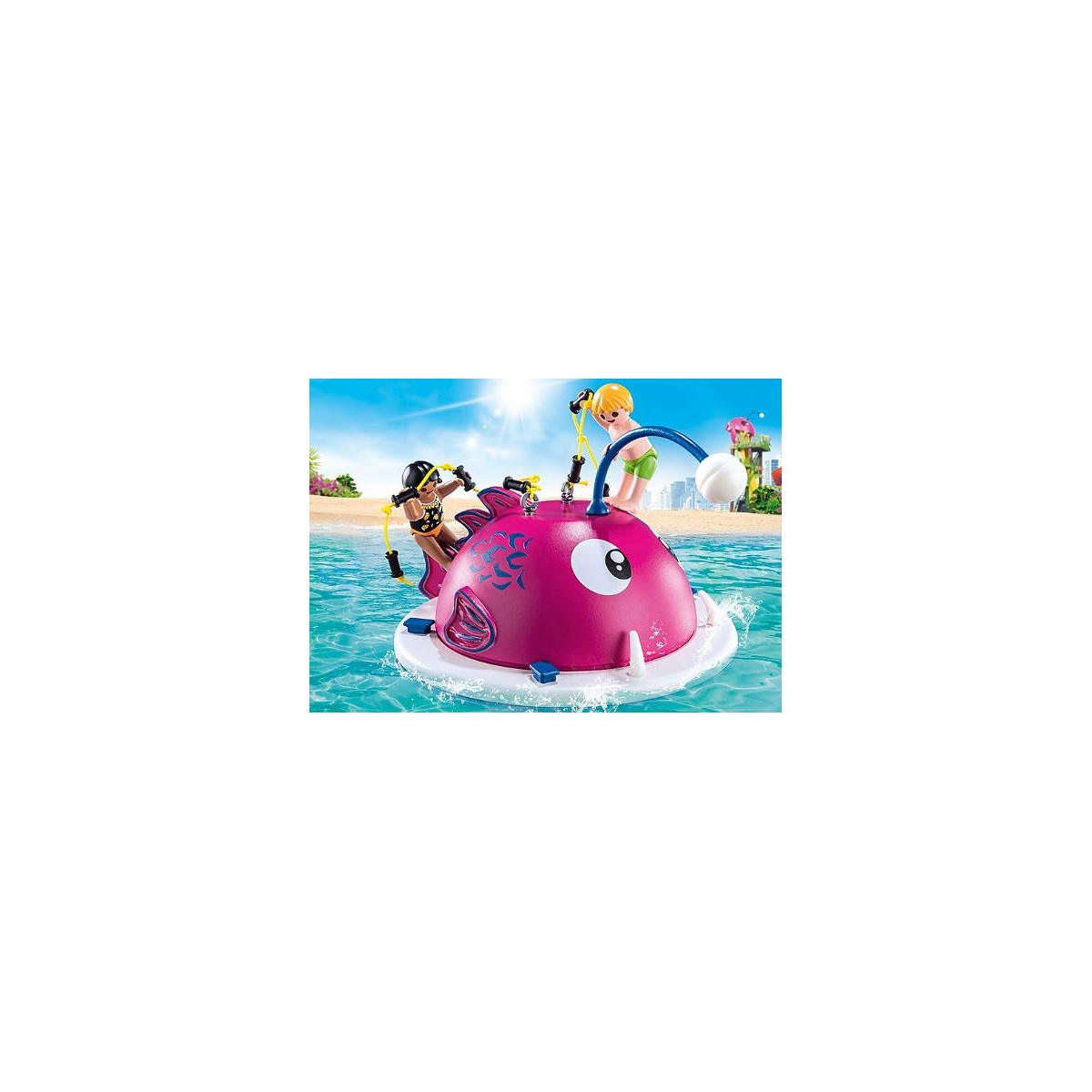 No hay mejor lugar para chapotear, trepar y retozar que la isla de escalada. No es fácil subir a la gigantesca cabeza del pez rosa, solo hace falta un poco de práctica. Primero se sube a la cima de la isla y luego se lánzate de nuevo al agua. Incluso cuando empieza a oscurecer, los niños no se cansan de esta diversión acuática de escalada. Qué bien que los dientes de los peces y la bola de la linterna brillen en la oscuridad. El set de juego consta de una isla de escalada con aspecto de pez y dos figuras PLAYMOBIL en bañador.