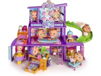En la planta baja se encuentra el potty parking para el potty car, la habitación con puerta secreta para escapar, litera de dos camitas para tus Bellies; además se encuentra la sala de cuidados con una camilla par acuidar de ellos donde puedes guardar todos los accesorios de tus kits