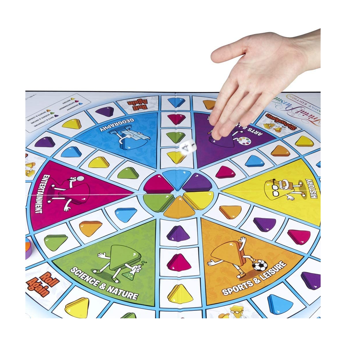 Juego Trivial Pursuit para jugar en familia, ¡a partir de 8 años! Este juego de trivia familiar con ritmo rápido incluye 400 tarjetas con 2400 preguntas en 2 barajas separadas: una para niños y otra para adultos. El juego Trivial Pursuit edición familiar incluye nuevas preguntas de trivia y un juego rápido, incluido el desafío Duelo, en el que 2 jugadores compiten por un triángulo al mismo tiempo. Juega individualmente o por equipos turnándose para desplazarse por el tablero y respondiendo correctamente las preguntas para ganar los triángulos. Los miembros de la familia pueden poner a prueba su inteligencia con una pregunta tras otra en 6 categorías: Geografía, Entretenimiento, Historia, Deportes y ocio, Arte y literatura, y Ciencia y naturaleza. Sé el primer jugador o equipo en ganar cada uno de los 6 triángulos de categoría, y responde correctamente una pregunta final para ganar. Trivial Pursuit, el logotipo asociado, el diseño distintivo del tablero de juego, las tarjetas de trivia, las fichas de juego y los triángulos de puntuación son marcas registradas de Hasbro. Hasbro Gaming y todos los términos relacionados son marcas registradas de Hasbro.