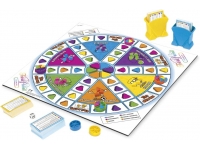 Tablero de juego, 400 tarjetas, con 200 tarjetas amarillas para niños y 200 tarjetas azules para adultos, 2 soportes para tarjetas, 6 soportes de quesitos, 36 quesitos, dado e instrucciones.