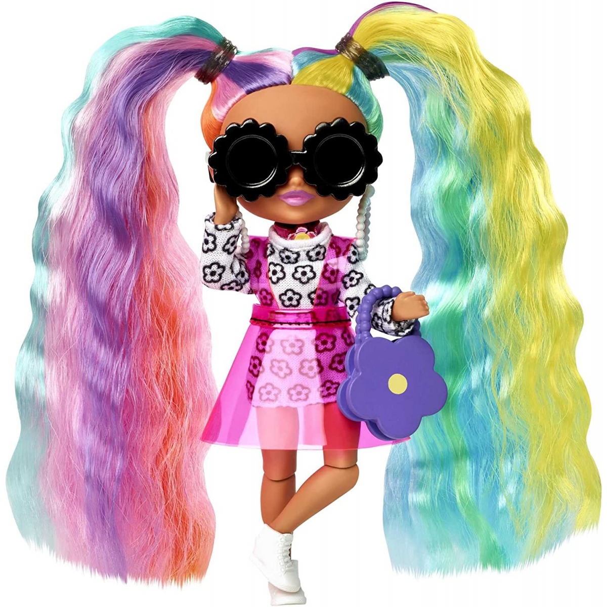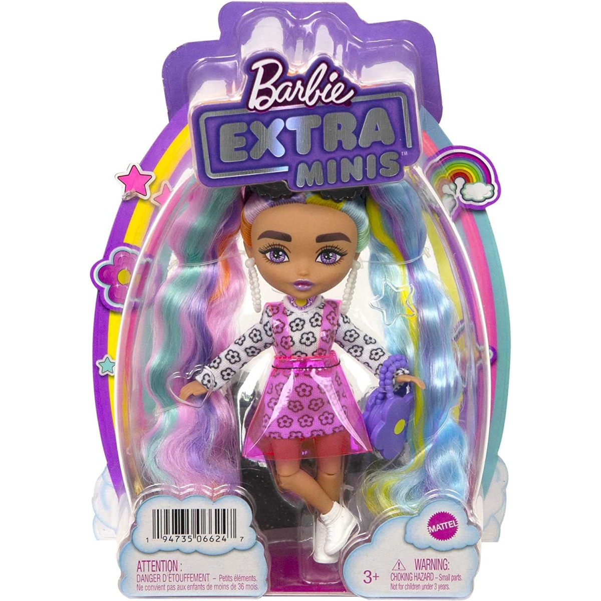 Esta muñeca Barbie Extra Minis luce una melena extralarga y ondulada de los colores del arcoíris recogida en dos coletas y lleva un peto de vinilo rosa encima de un vestido con estampado de margaritas.