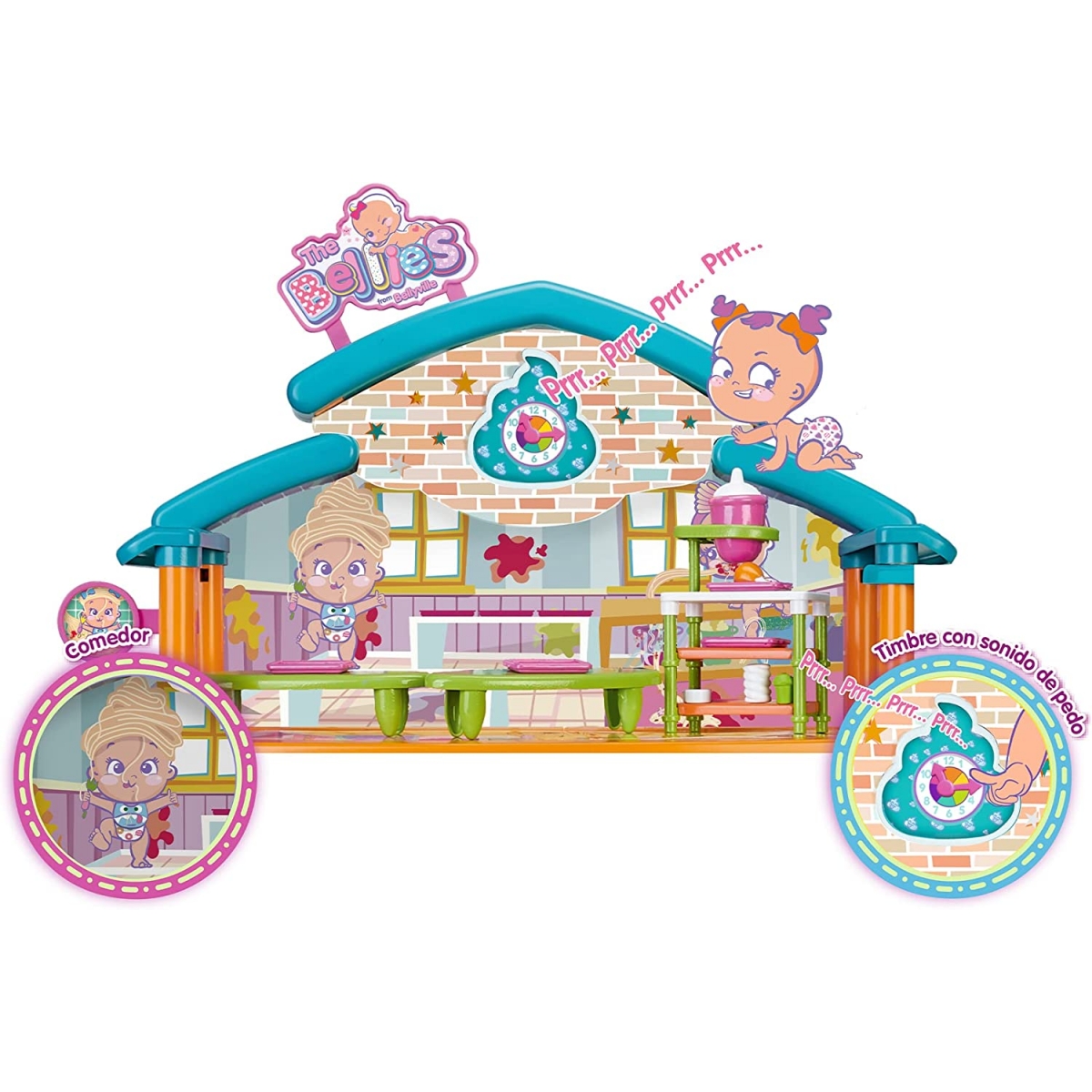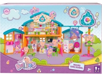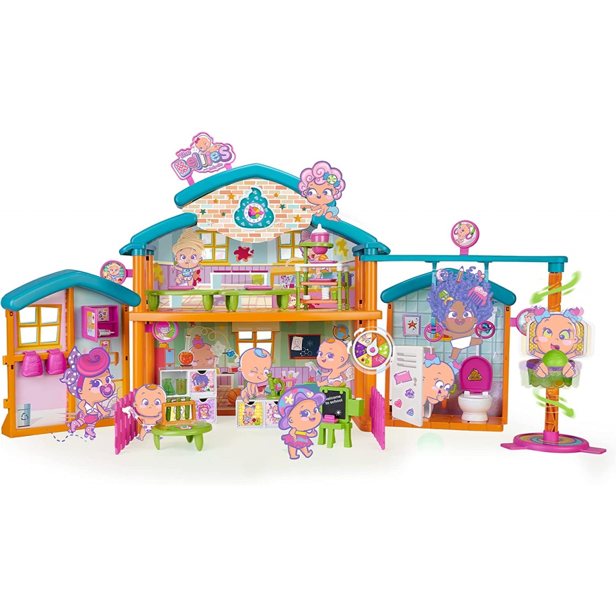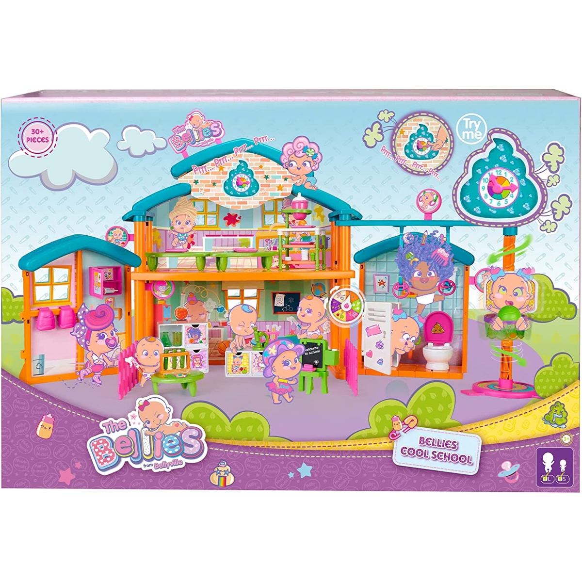 Bellies Cool School es el set de juego perfecto para jugar con tus Bellies, Biggies y Mini Bellies; un lugar lleno de diversión y un montón de aventuras. El colegio más cool de Bellyville es muy completo, tiene un montón de espacios divertidos como un aula para hacer travesuras, un laboratorio con todo lo que necesitas para hacer experimentos divertidos, un baño y una enfermería con botiquín de primeros auxilios. En la planta de arriba hay un comedor cool para nuestras hambrientas Bellies, con mesas, bandejas de comida y más accesorios; Además, también hay un área de juego y deporte con un tobogán para deslizarse en espiral y unas cuerdas de anillas. En total hay más de 30 accesorios de juguete súper divertidos, como una pizarra con tiza y borrador, un instrumento musical que suena como pedetes,un microscopio, etc. Y el cole tiene sonido, cambia la hora en el reloj del colegio y escucha el timbre sonar.