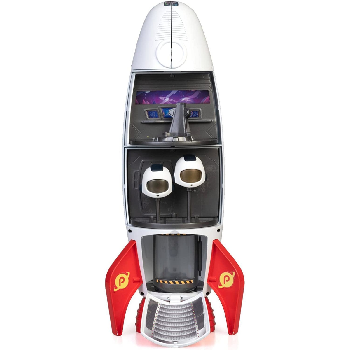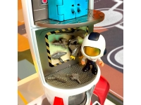Cohete espacial de 4 plantas de Pinypon Action convertible: Puedes jugar con él cerrado y, cuando lo abres, encontrarás distintas plantas: En la planta baja está la cabina de desinfección y la 1ª planta es giratoria con un almacén de cascos y otro de armas. La 3ª planta también es giratoria y allí se encuentra la sala de mandos y la cabina del piloto espacial con sillón giratorio. En la 4ª planta está la sala de máquinas donde se almacena un brazo mecánico, un robot y los residuos de la nave.Están incluidas 2 figuras de astronautas, 1 de ellos es un peligroso impostor.
