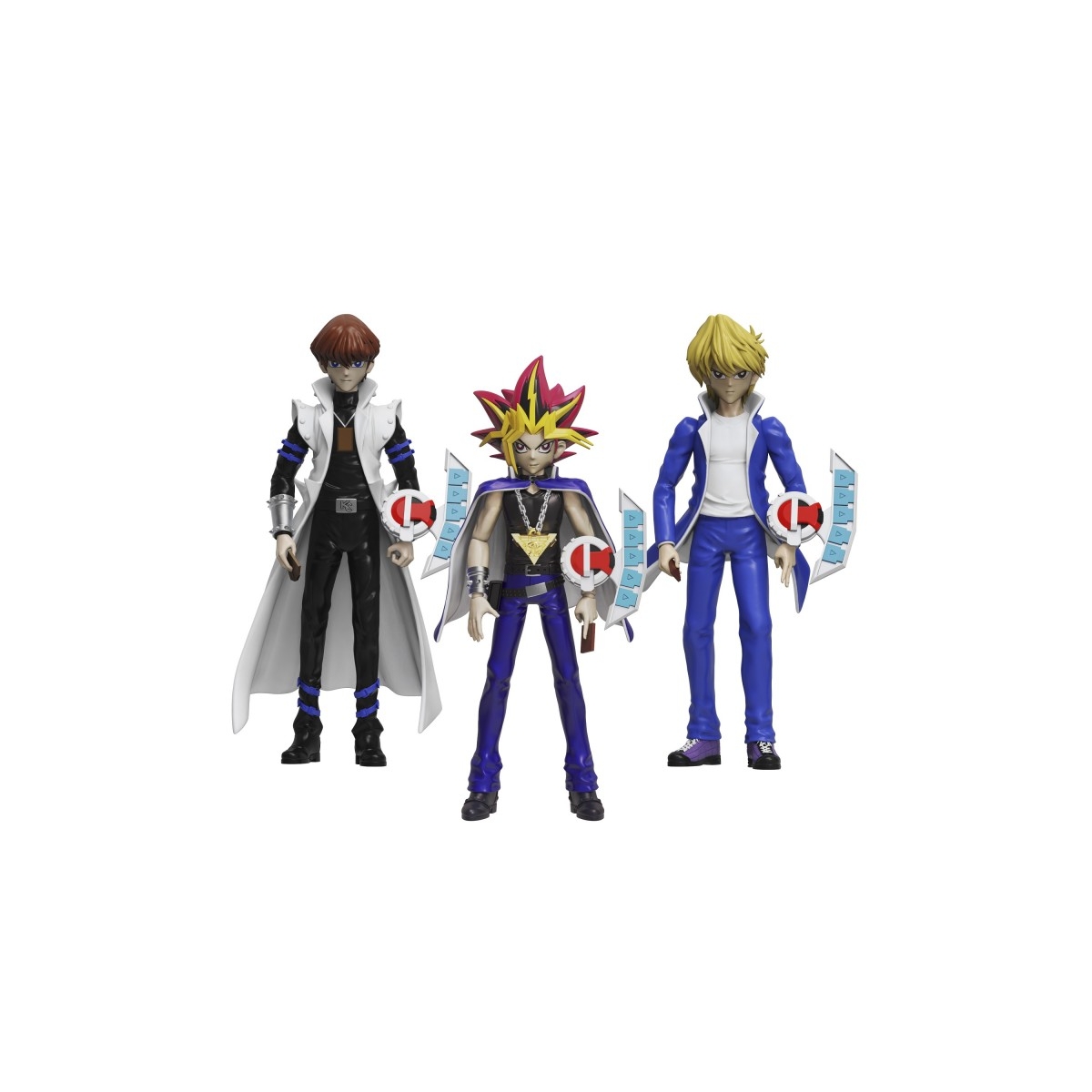 Increíbles figuras de acción de 13 cm con 6 puntos de articulación de los personajes principales de la serie con todos los accesorios listos para el combate. Con su gran detalle de manos extra para conjuros, DUEL DISK y tarjeta BONUS para convertirte en el Duelista definitivo. Figuras asombrosas de Yugi, Kaiba y Wheeler.