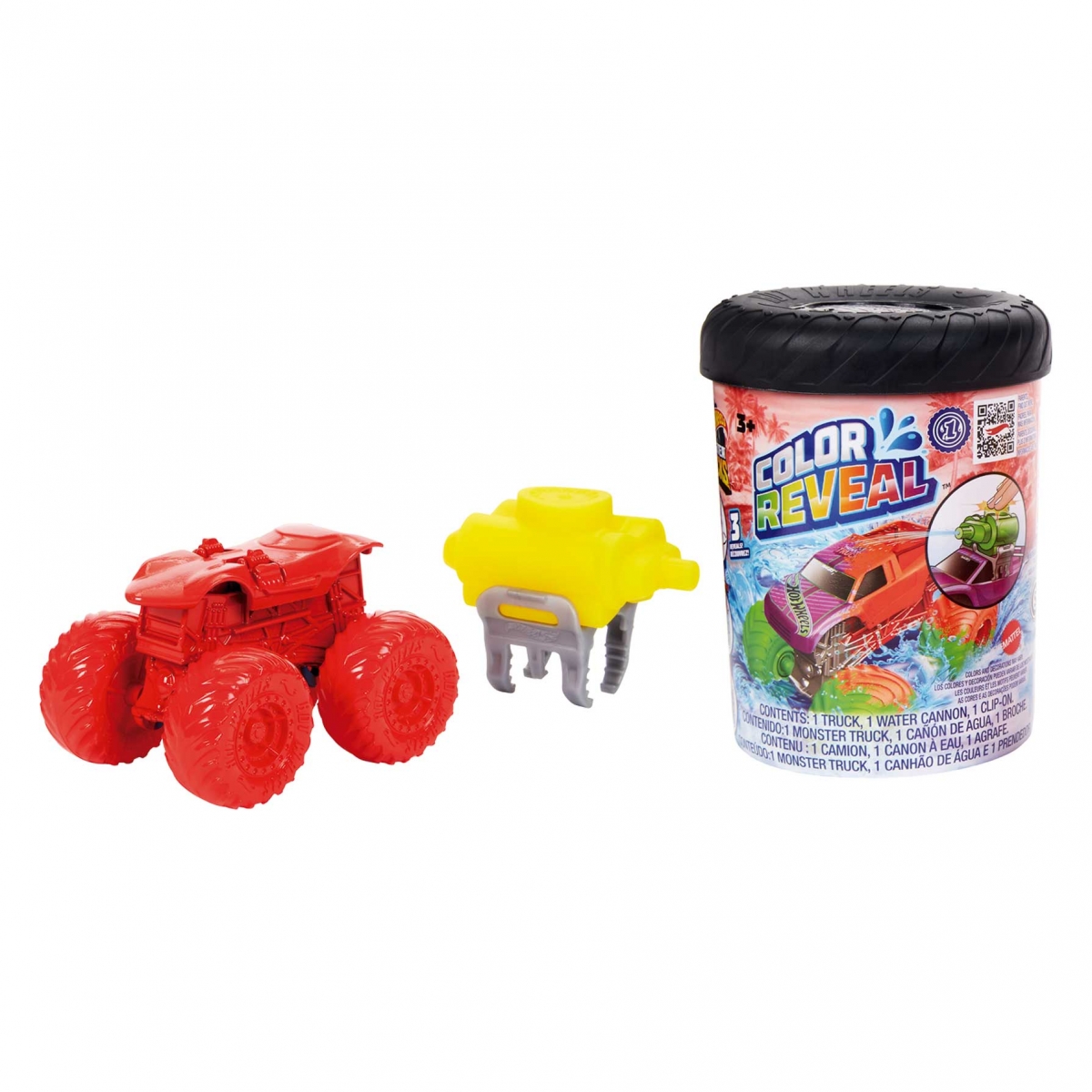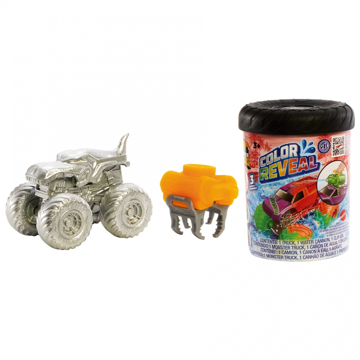 ¡Los camiones Hot Wheels Monster Trucks Colour Reveal esconden increíbles sorpresas! Dentro de cada tambor se encuentra un camión Hot Wheels Color Shifters Monster Truck a escala 1:64 que cuenta con un revestimiento especial Color Reveal y un depósito de agua con broche. Para mostrar su color, llena el tambor con agua y remoja el camión hasta que el agua cambie de color. ¡Luego, sácalo para revelar el nuevo color del Monster Truck! Quieres volver a cambiar su aspecto? Llena el tambor con agua fría y sumérgelo para ver cómo cambian los colores por arte de magia. Y si quieres aún más cambios, ¡mételo en agua caliente! Utiliza el depósito de agua con broche para rociar los camiones Color Shifters con agua y hacerlos cambiar de color para lograr una batalla acuática épica. Los más pequeños querrán hacerse con toda la colección. Se venden por separado y están sujetos a disponibilidad. Los colores y la decoración pueden variar.
