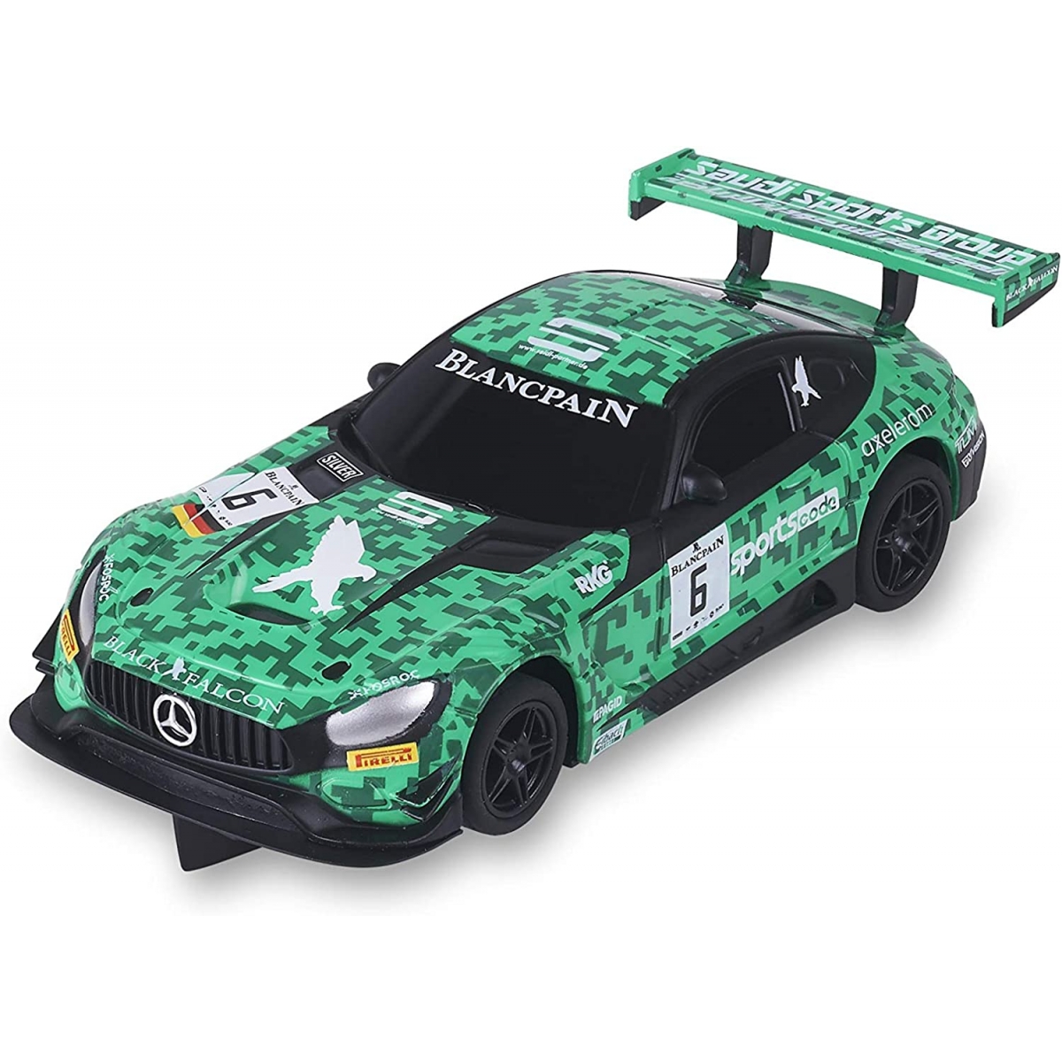 Dos coches Slot incluidos: La experiencia con dos coches de carreras slot GT: Un Mercedes AMG GT3 "Green" y un Audi R8 LMS GT3 "AudiSport". Monta el circuito y disfruta desde el primer día.