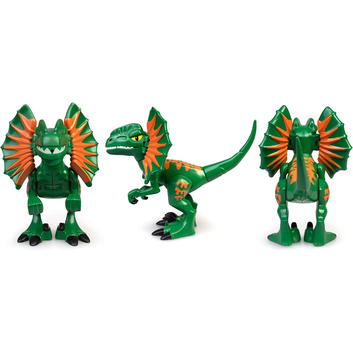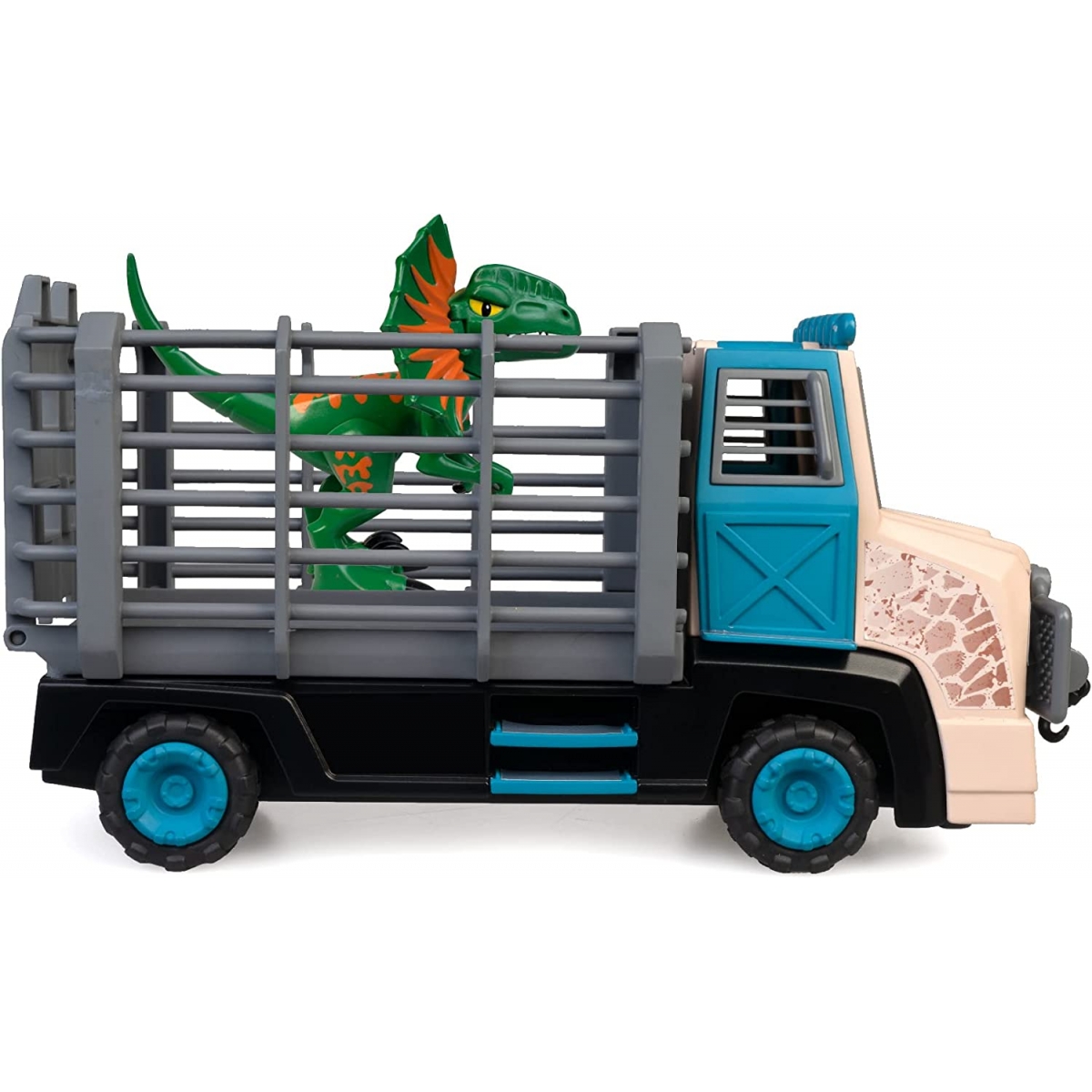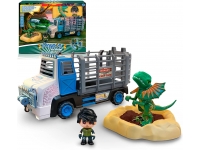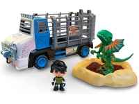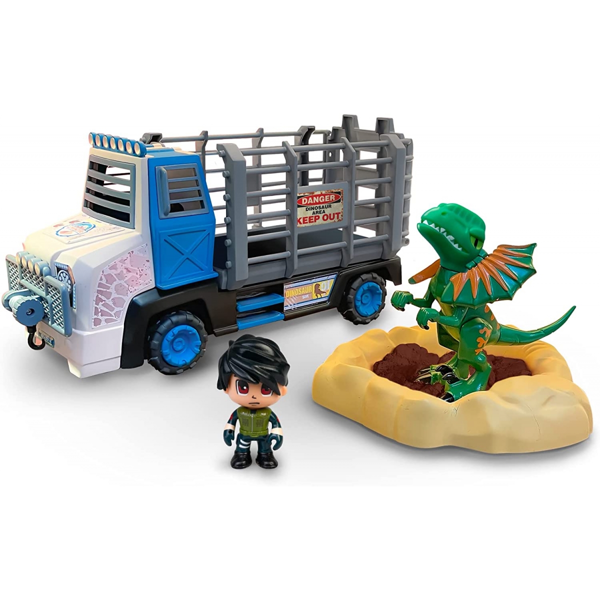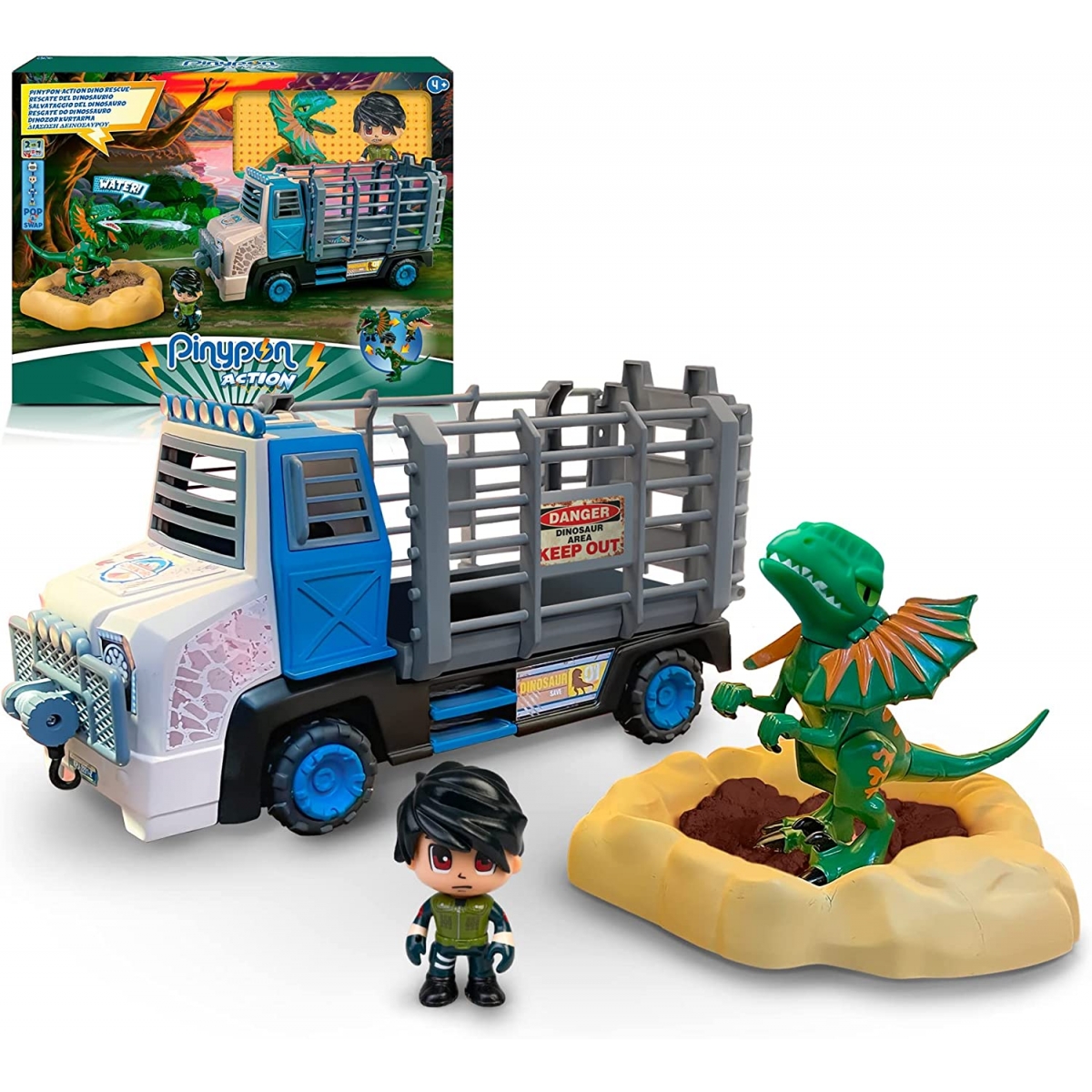 Set completo de rescate del dinosaurio Dilophosaurus atrapado en un pozo de arenas movedizas. La figura escupe, llenando el depósito que tiene en la cabeza con agua. El explorador rescata al dinosaurio con el camión especial, arrastrándole de las arenas con la polea y metiéndole en la parte trasera. El camión es compatible con todos los dinosaurios de la colección Pinypon Action. El juguete incluye el camión, figuras del dinosaurio y explorador, base del pozo y arena mágica.
