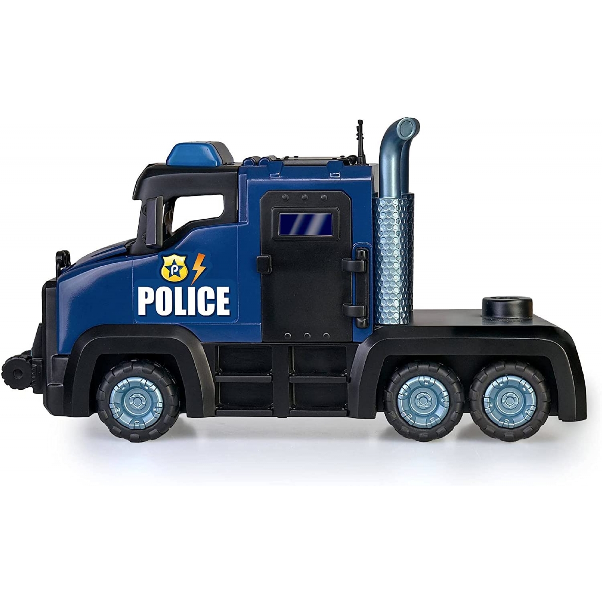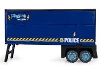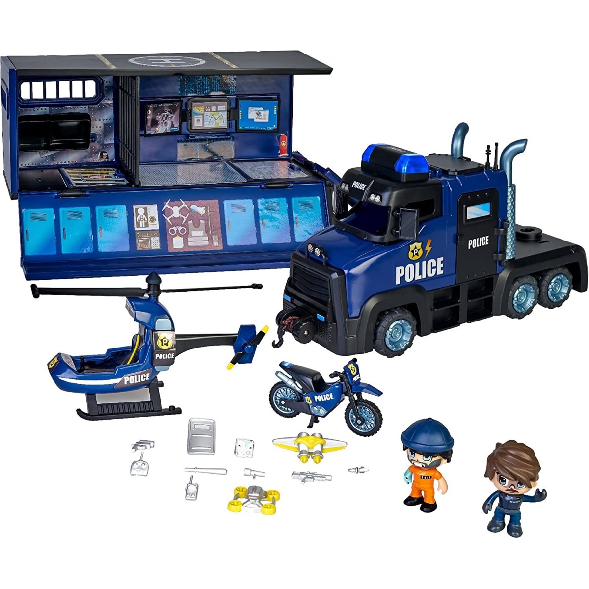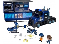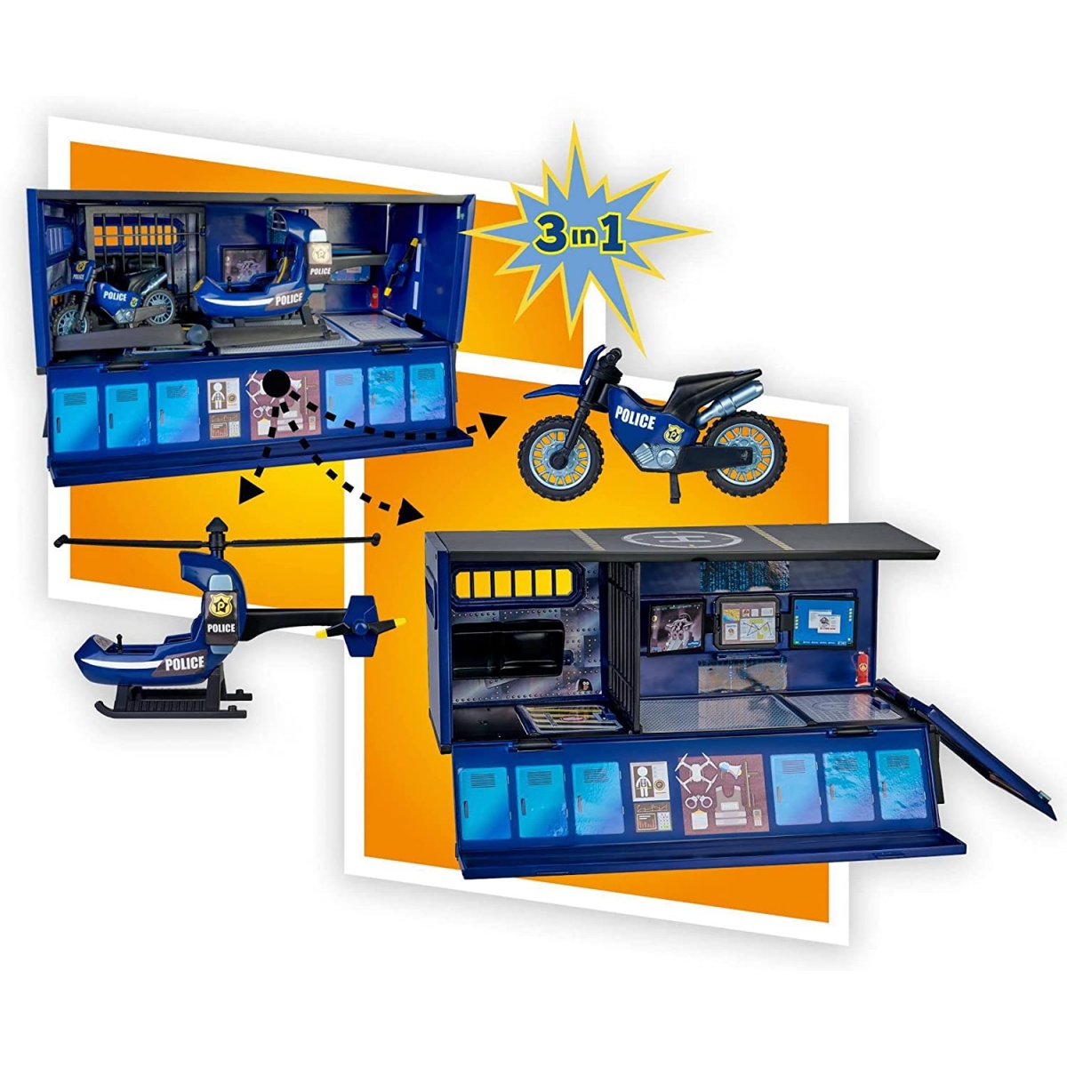 Un auténtico juguete 3 en 1: un súper camión de policía de 64cm con luces que se pueden quitar, un contendor de vehículos y un escenario de centro de operaciones. Se pueden separar las piezas y jugar con cada una por separado. Dentro del tráiler hay un centro de operaciones con muchas pantallas y una celda con rejas. Plegando las rejas, la cama y las pantallas se pueden aprovechar todo el espacio interior como contenedor de vehículos. Encima del tráiler hay un helipuerto para los aterrizajes y una rampa para entrar directamente con la moto. El gran set incluye 1 moto; 1 mini helicóptero, 2 figuras (policía y preso) y muchos accesorios de policías.