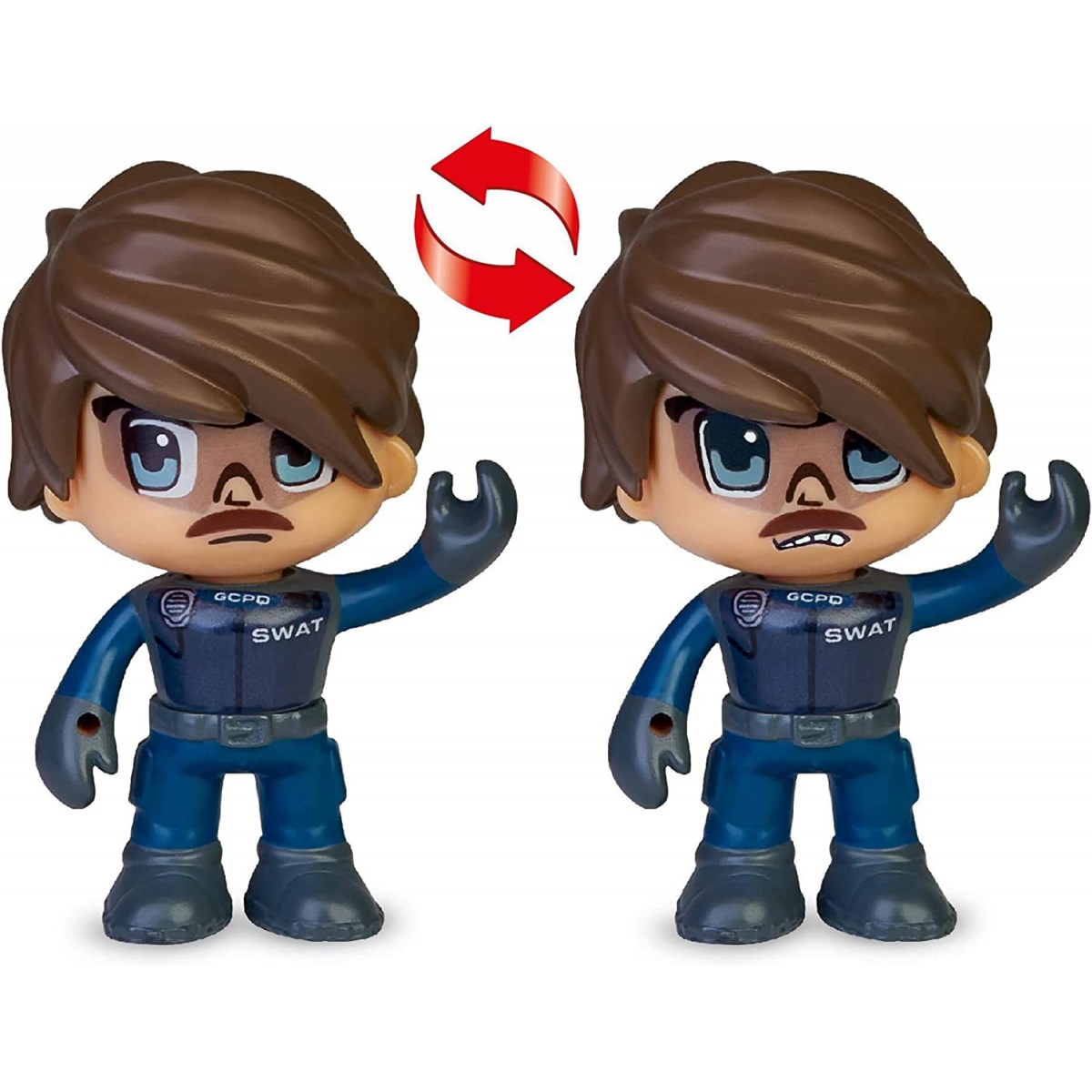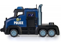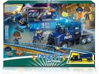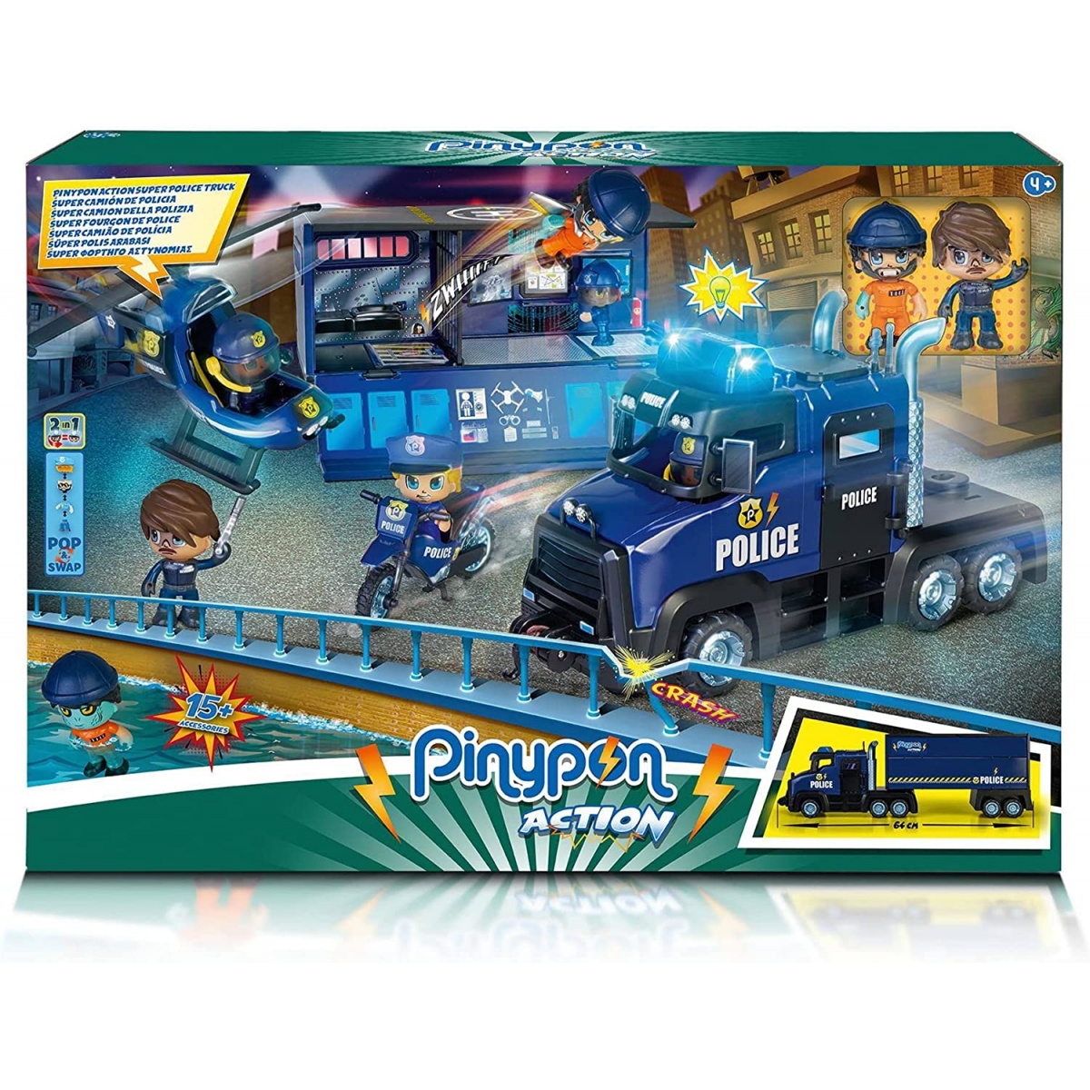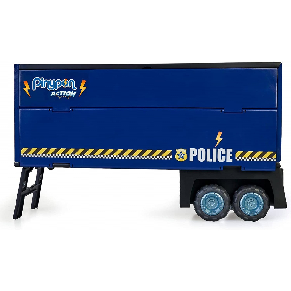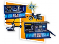 Un auténtico juguete 3 en 1: un súper camión de policía de 64cm con luces que se pueden quitar, un contendor de vehículos y un escenario de centro de operaciones. Se pueden separar las piezas y jugar con cada una por separado. Dentro del tráiler hay un centro de operaciones con muchas pantallas y una celda con rejas. Plegando las rejas, la cama y las pantallas se pueden aprovechar todo el espacio interior como contenedor de vehículos. Encima del tráiler hay un helipuerto para los aterrizajes y una rampa para entrar directamente con la moto. El gran set incluye 1 moto; 1 mini helicóptero, 2 figuras (policía y preso) y muchos accesorios de policías.