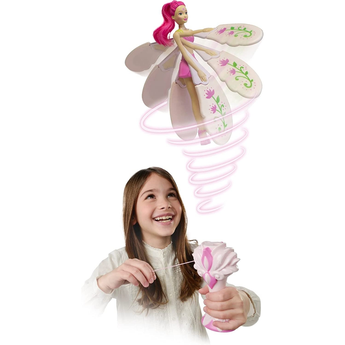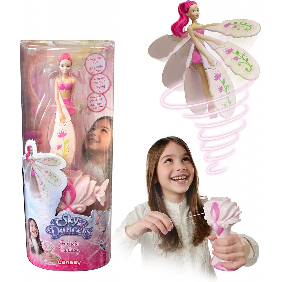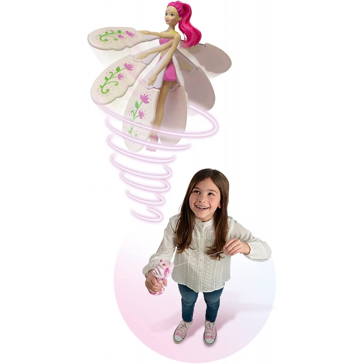 Muñecas de 18 cm que vuelan de verdad. Sus bases miden 14 cm, tenemos 3 modelos diferentes para elegir, color coral, la rosa y la morada. ¡Querrán hacerlas volar cada vez más alto! Cada una de ellas tiene una personalidad y un poder: Fuchsia Fantasy: Tiene el poder de hacer crecer las flores y la vegetación. Purple Licious: Tiene el poder de transformar las nubes en algodón de azúcar. Coral Cutie: Tiene el poder de la velocidad, puede bailar en las estrellas fugaces.