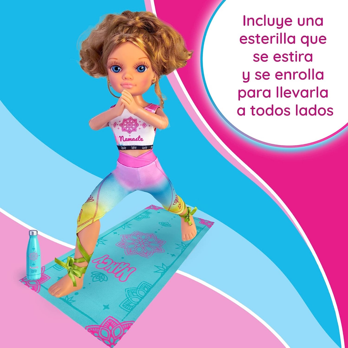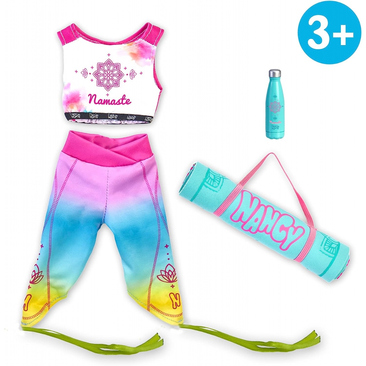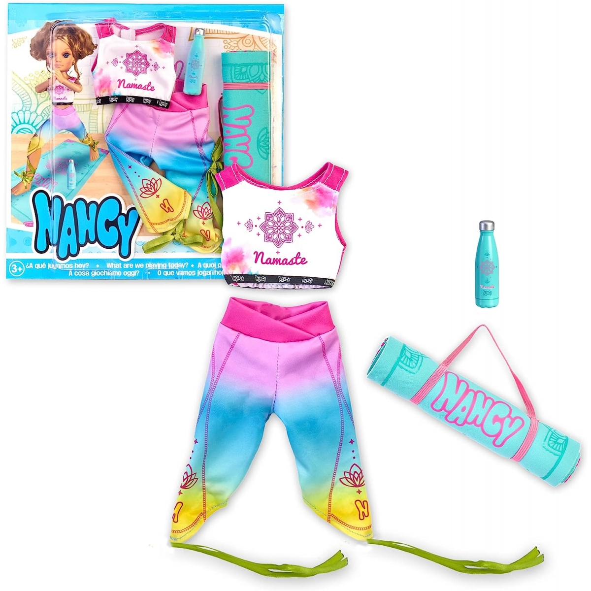 Nancy, Un día de Yoga es el conjunto perfecto para una clase de yoga. Este conjunto de top y mallas le permite a Nancy ser de lo más flexible mientras va a la moda. Inclye una esterilla y una botella de agua.